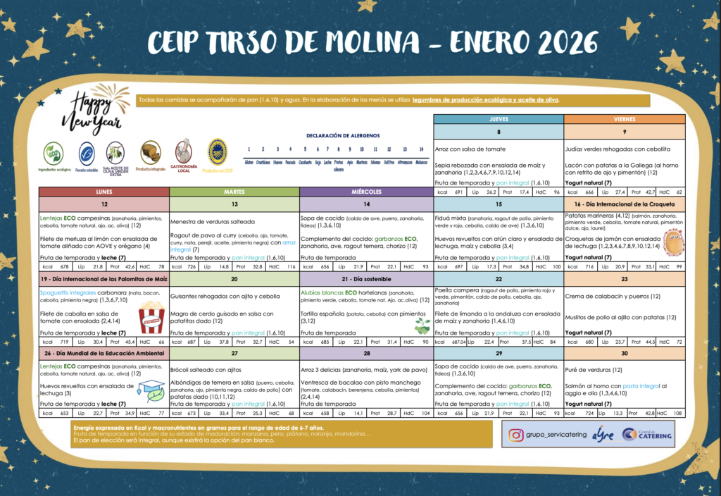 Comedor Menú Comedor: Enero 2026 Posted on noviembre 6, 2025enero 9, 2026 Author Comentarios desactivados en Menú Comedor: Enero 2026 Puedes consultar el menú completo aquí Y también las sugerencias para las meriendas y las cenas.